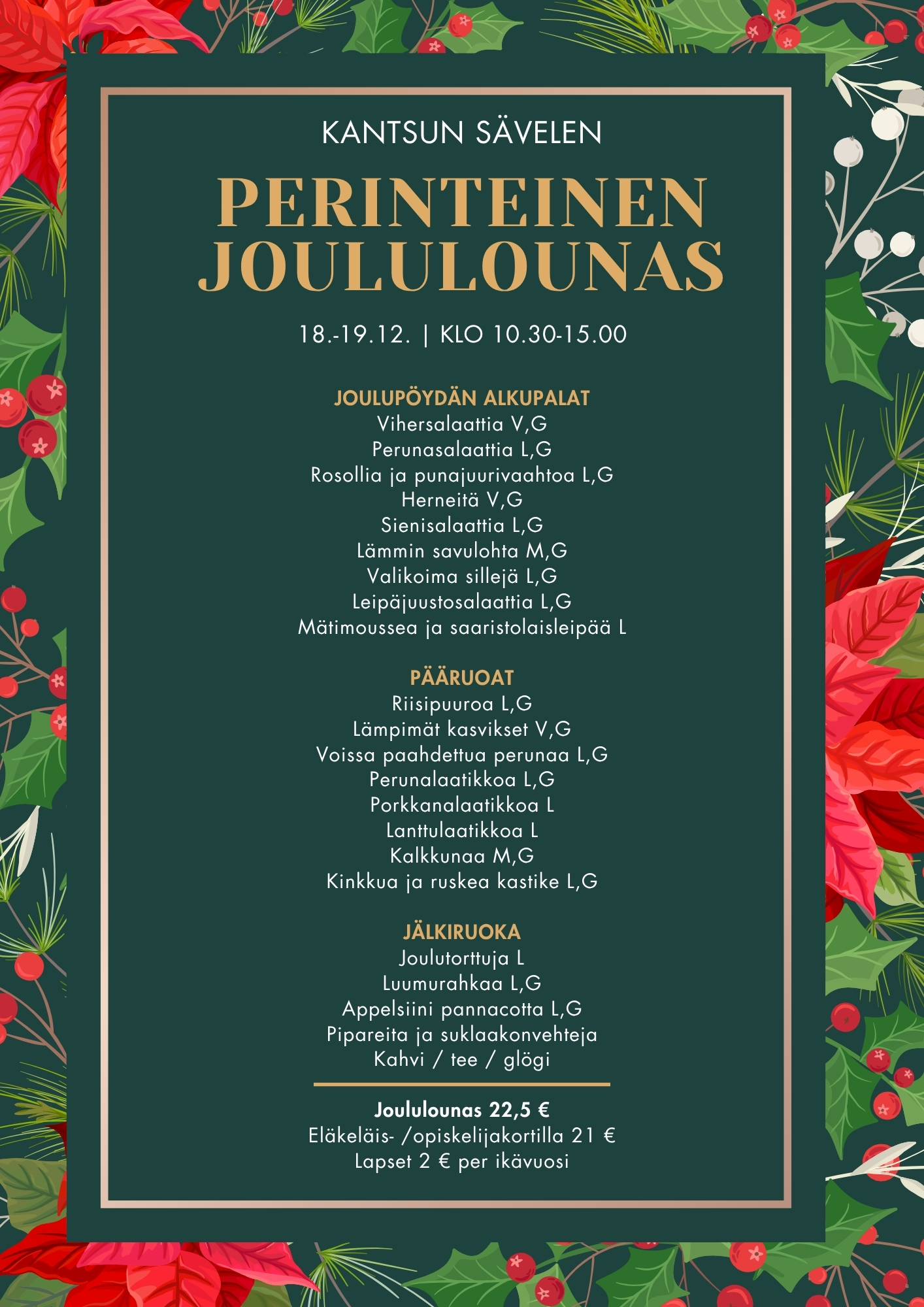 Joululounas 18.-19.12. | klo 10.30 – 15.00 | Buffet 22,50 € / hlö